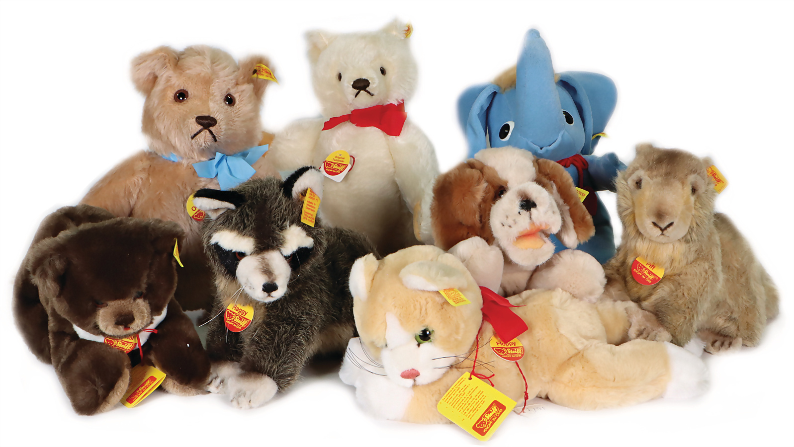 Konv. 8 Art., Piff kompl., Anhänger mit Geschmacksmusteranmeldung beim Amtsgericht, Nummer 3627, 24cm, Bär orig. kompl., Anhänger mit Geschmacksmusteranmeldung Anhänger mit Geschmacksmusteranmeldung beim Amtsgericht Nummer 3407, 35cm, Elefant kompl., blau, Anhänger mit Geschmacksmusteranmeldung beim Amtsgericht Nummer 3237, 27cm, Hund kompl., Anhänger mit Geschmacksmusteranmeldung beim Amtsgericht Nr. 3065, 21 cm, Original Teddy Bär weiß kompl., Anhänger mit Geschmacksmusteranmeldung beim Amtsgericht Nr. 3150, 32 cm, Hund kompl., Anhänger mit Geschmacksmusteranmeldung beim Amtsgericht Nummer 3060, 23cm, Raggy kompl., Anhänger mit Geschmacksmusteranmeldung beim Amtsgericht Nr. 3624, 21 cm, Floppy Katze kompl., Anhänger mit Geschmacksmusteranmeldung beim Amtsgericht Nr.3191, 30cm, sehr guter Zustand.