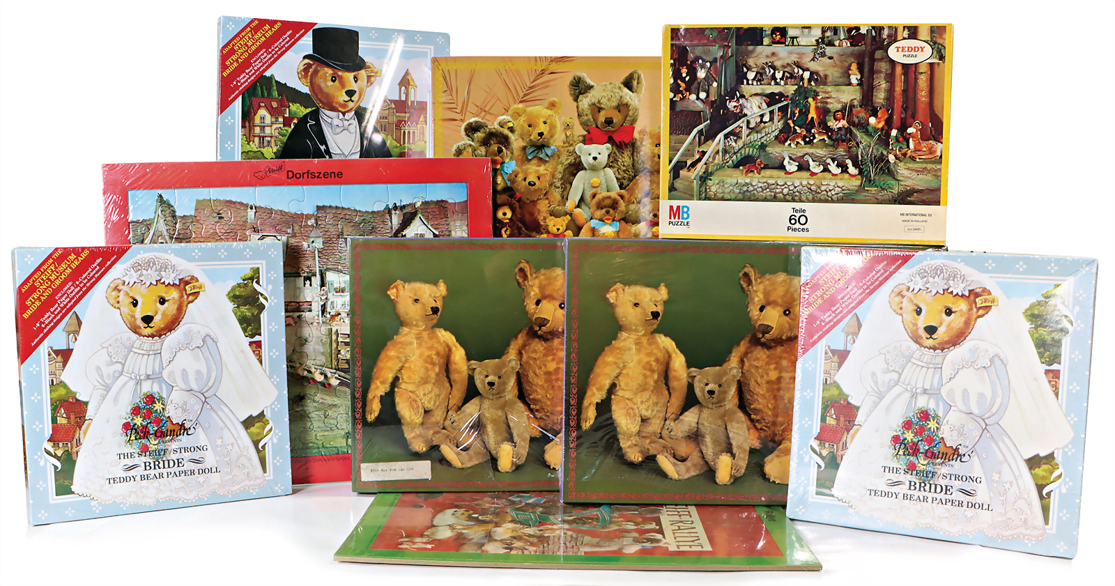 Konv. div. Puzzle-Spiele, 9 Art., Family Portrait 1902-1903, Knopf im Ohr, Teddy Puzzle, STEIFF Rally, Teddy Bear Paper Doll, teils im Original Karton verschweißt, guter Zustand, auf Vollständigkeit nicht geprüft.