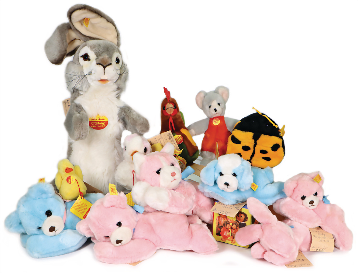 Konv. 13 Art., 2x Baby Floppy, Bär, Nr.5650/25, Nr. 5651/25, rosa, blau, mit Knopf, gelber Fahne, Werkmusteranhänger und Metallsiegel, 30 cm, Floppy Katze, Nr. 5665-25, mit Knopf, gelbe Fahne, 30cm, Werkmusteranhänger und Metallsiegel, Baby Floppy Hase, Bär, Hund, Nr. 5650/18, Nr. 5655/18, Nr. 5661/18, mit Werkmusteranhänger und Metallsiegel, 21 cm, mit Brustschild, Werkmusteranhänger und Metallsiegel,19cm, Kosi Piccy mit Brustschild, Werkmusteranhänger und Metallsiegel, 11 cm, Gallo Musikhahn, Nr. 6376/18 mit Handmusterschild und Metallsiegel, 19cm, Spielwerk intakt, Jolly Hase, Handspielpuppe kompl., mit Werkmusteranhänger und Metallsiegel, 50cm, Ente, mit gelber Fahne, Werkmusteranhänger und Metallsiegel,15 cm, Marienkäfer Tasche, Nr8481/18, Knopf und gelbe Fahne, mit Handmusterschild und Metallsiegel, 17cm, Würfel, Nr. 6445/10, mit gelber Fahne, mit Werkmusteranhänger und Metallsiegel, 10 cm.
