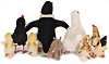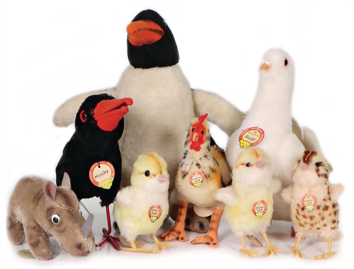 Konv. 8 Art., 60er Jahre, Pinguin, Knopf, Schild und Fahne fehlen, mit Original Steiff-Archivanhänger Nr. 4625/06, Cosy Charly, Pinguin, 28cm, Hucky Rabe, mit Brustschild, Nr. 7317, mit original Steiff-Archivanhänger, 18 cm, Küken, Nr. 3380/12, mit Brustschild, 11 cm, Küken, Nr.3380/12, mit Original Steiff-Archivanhänger, 12 cm, Küken 3385/12, mit Brustschild 12cm, mit Original Steiff-Archivanhänger, Hahn komplett, Nr. 1316/04, 16cm, Taube kompl., Nr.2564/25, mit Original Steiff-Archivanhänger, 21 cm. Nashorn, Knopf, Schild und Fahne fehlen, mit Original Steiff-Archivanhänger, 13 cm.