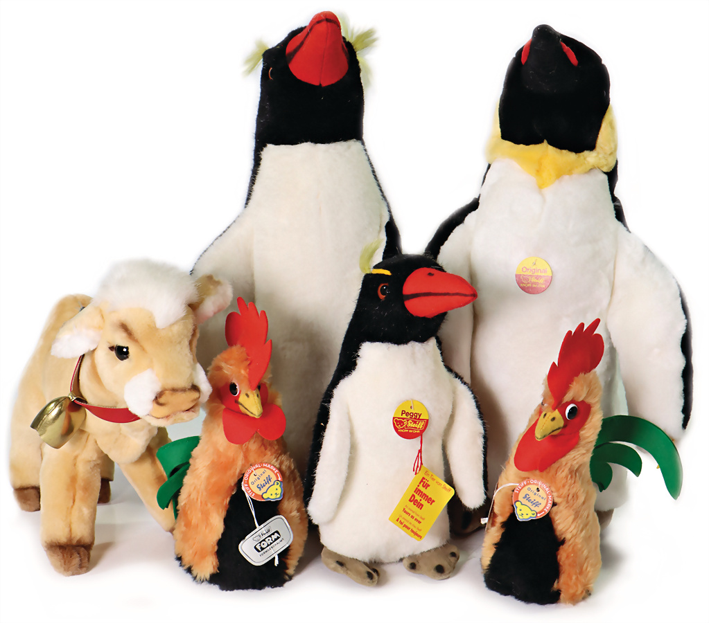 Konv. 6 Art., 80er Jahre, Pinguin kompl. Nr. 2510/40, mit original Steiff-Archivanhänger, 43 cm. Peggy Pinguin, Brustschild Knopf und Fahne fehlen, Nr. 2505/40, 42 cm mit original Steiff-Archivanhänger. Cosi Flora, Nr. 5477/25, mit Handmuster, Anhänger und Metallsiegel, 27cm, 2x Hahn, mit Brustschild, Form geschäumt, Anhänger, Formgeschäumt, Hahn Nr.6158/20 mit Orig. Steiff-Archivanhänger, 23cm, Peggy Pinguin mit Brustschild Nr.2505/27, 26cm mit Original Steiff-Archivanhänger,