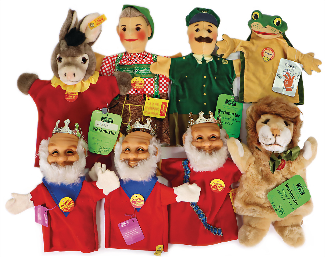 Konv. 8 Art., 3x Handspielpuppe König mit Original Steiff-Archivanhänger, 7021-27, 7073-17, 1x kompl., 2x nur mit Brustschild, 23 cm,Handspielpuppe Polizist, Anhänger Werkmuster mit Metallsiegel, Nr. 255267, mit Knopf und gelber Fahne, 29 cm, Handspielpuppe Happy Löwe kompl., Anhänger-Werkmuster mit Metallsiegel, Nr. 253751, 30cm, Handspielpuppe Esel kompl., Anhänger-Werkmuster mit Metallsiegel, Nr. 6484-28, 30cm, Handspielpuppe Zeppl mit Brustschild, Original Steiff-Archivanhänger Nr. 7054-28, 29cm, Handspielpuppe Froggy mit Brustschild, 20cm, mit Original Steiff-Archivanhänger Nr. 0417-00