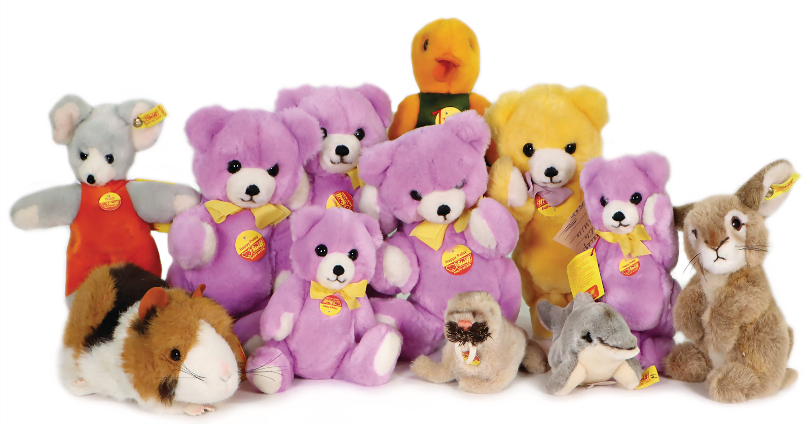 Konv. 13 Art., 6x Happy Patsy kompl., mit Anhänger-Werkmuster mit Metallsiegel, versch. Größe von 20-25 cm, Toldi Ente mit Brustschild, Orig. Steiff-Archivanhänger, Nr. 6264-22, 20cm, Mini Cosy Delfin Nr. 5388-15 mit Knopf und gelber Fahne, 19cm, Dormily Hase mit Knopf und gelber Fahne, Nr. 2977-20, 20cm, Brustschild, Anhänger-Werkmuster mit Metallsiegel Nr. 2254-15, 21cm, Volley Walros mit Brustschild, Original Steiff-Archivanhänger Nr.1474-10, 16 cm, Toll die Maus kompl.,mit Original Steiff-Archivanhänger 6248-20, 20cm. Guter Zustand